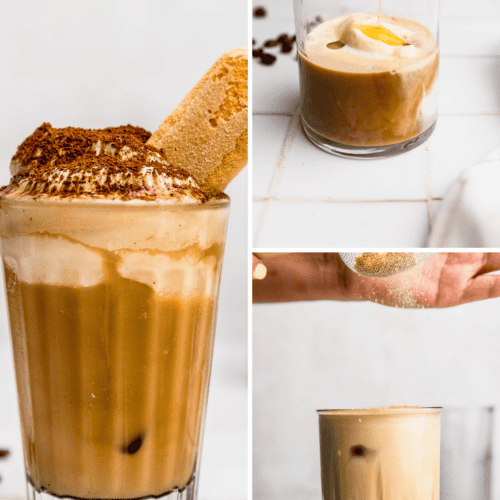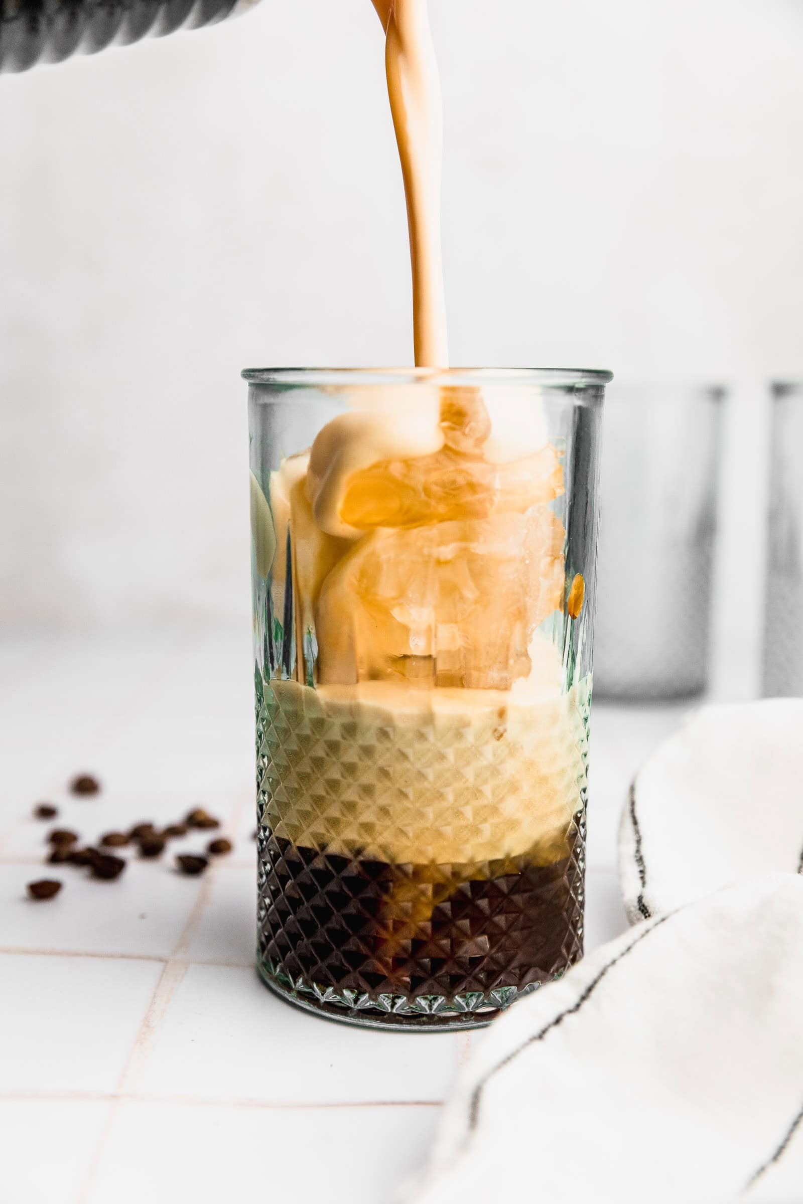Llena un vaso de hielo. Agrega el café y llena con leche dejando un dedo sin cubrir.