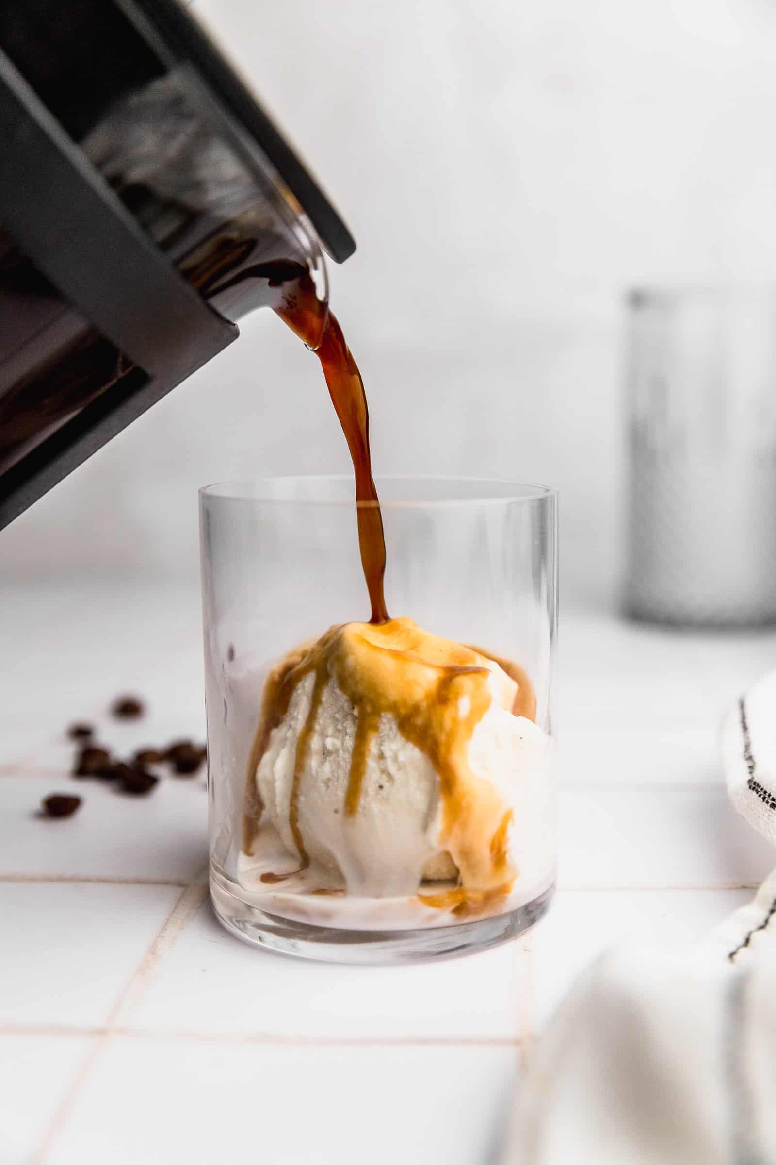 En un vaso o pocillo pon una bola de helado. Encima vierte el café. Termina con un chorrito de aceite de oliva y sal gruesa o en hojuelas.