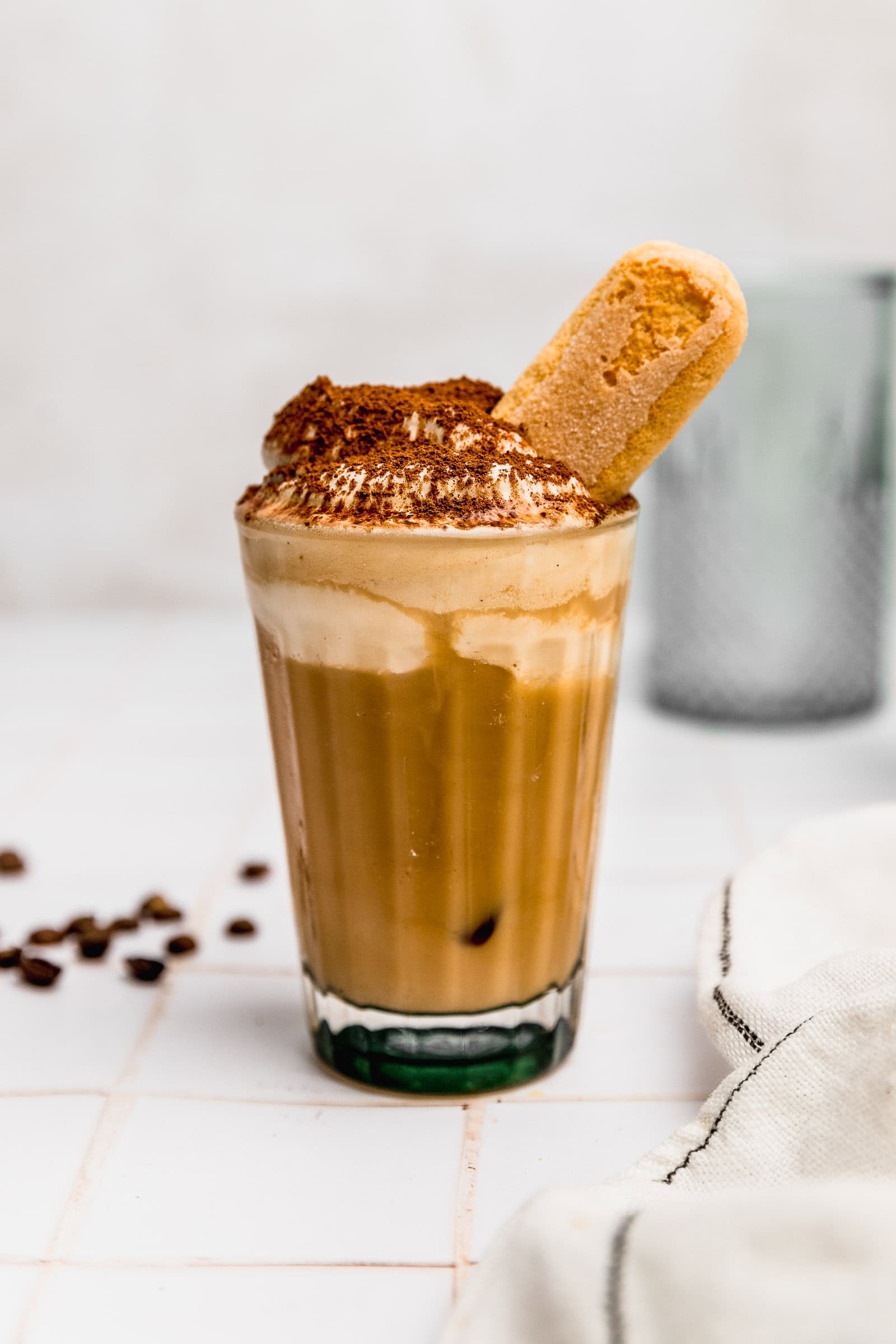 Agrega un par de cucharadas de la crema de mascarpone y decora espolvoreando cacao en polvo y con una galleta de champagne / bizcotela.
