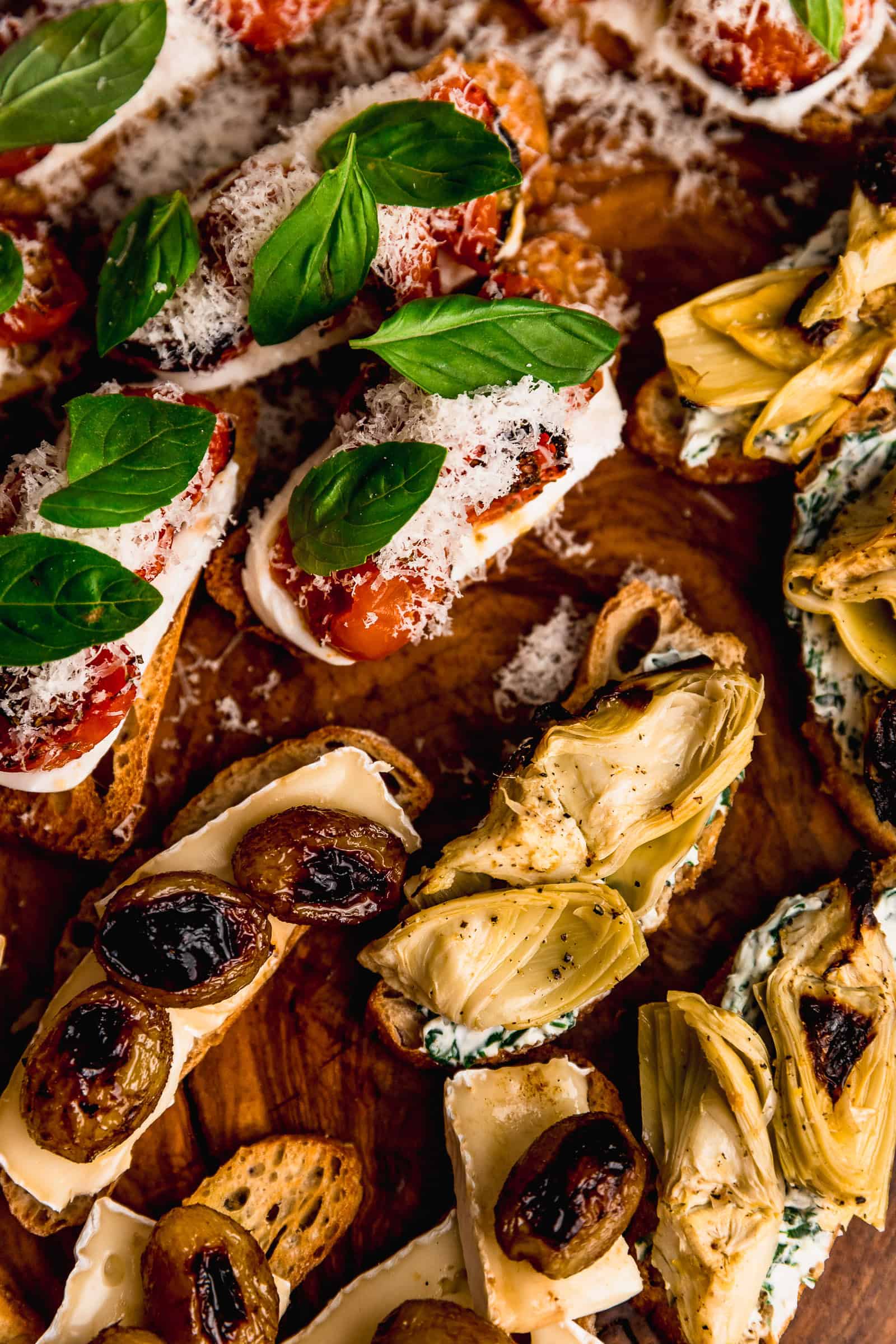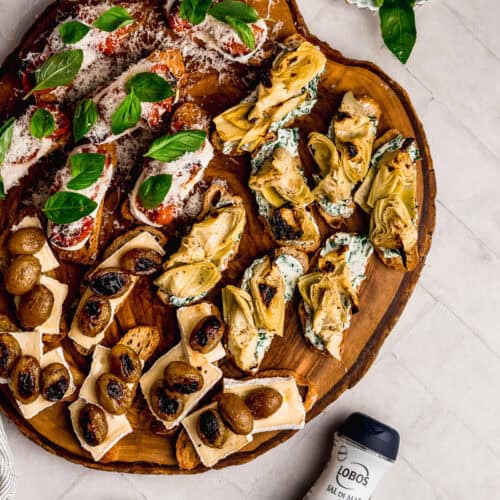 Me encanta hacer crostini y qué mejor si puedes hacer tres tipos de una sola vez. Aquí te enseño a hacer unos con queso brie y uvas, otro con queso crema, espinaca y alcachofas y uno de mozzarella, tomate cherry y albahaca.