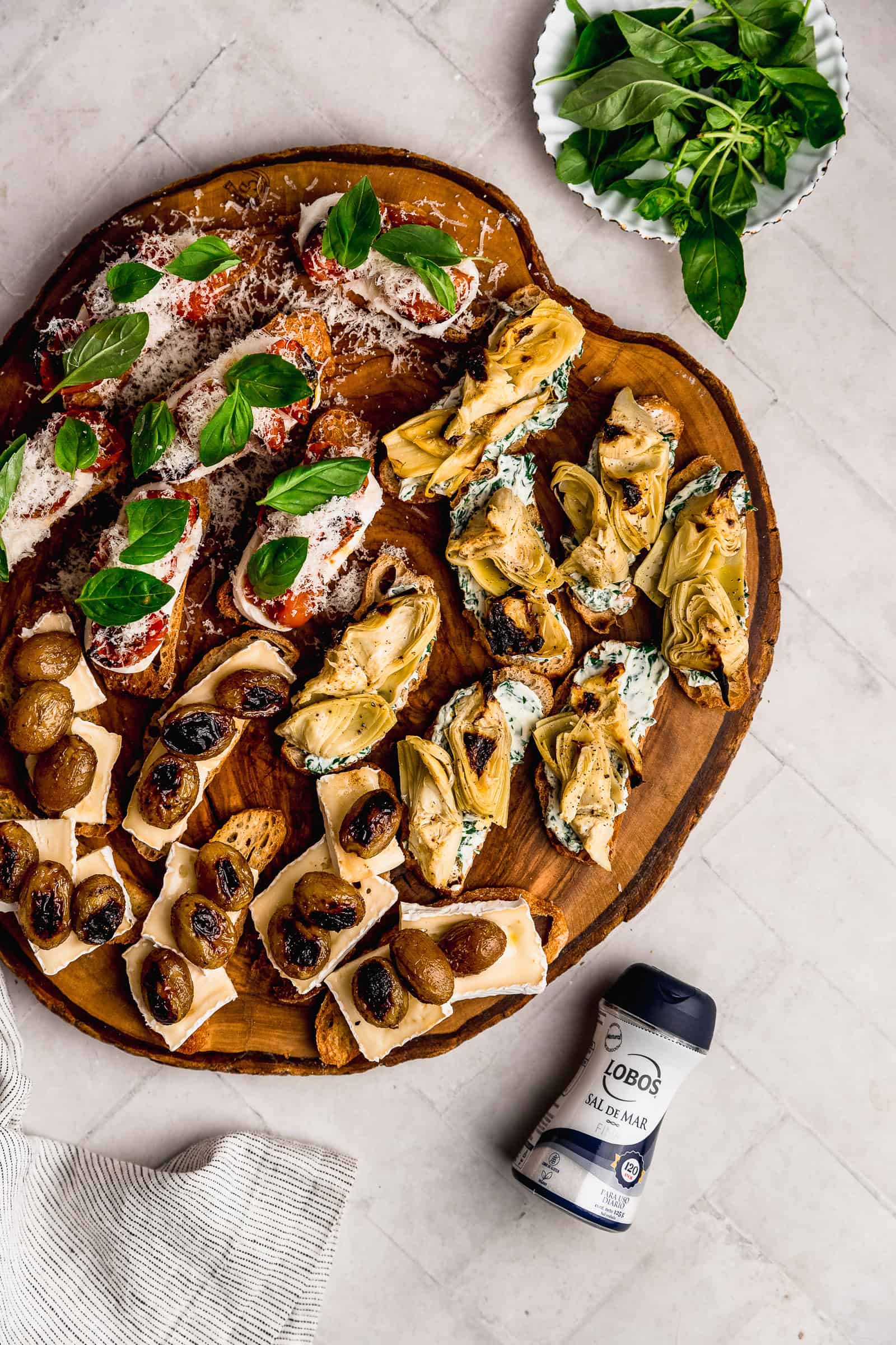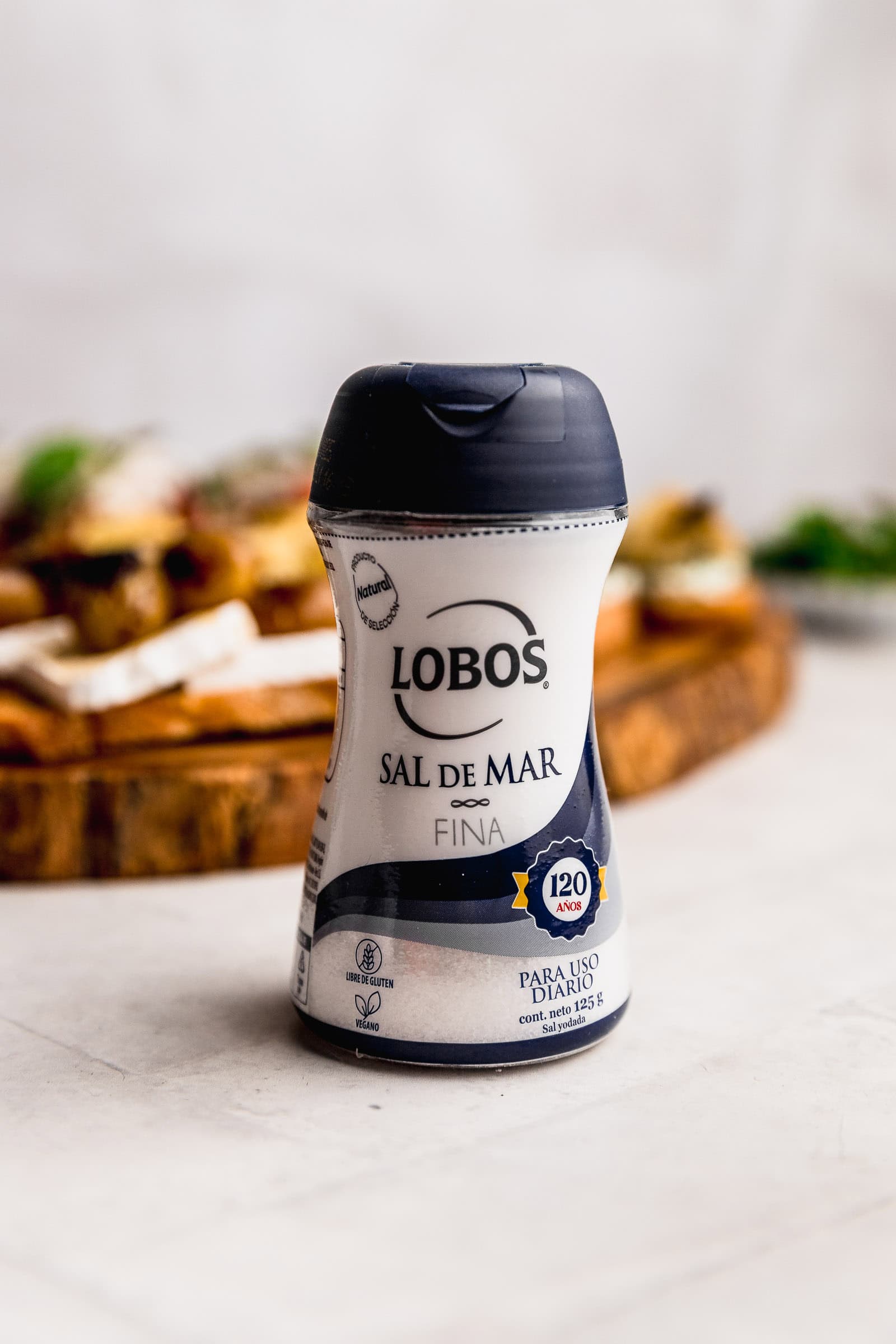 «Crostini» es una palabra en italiano para tostadas servidas con otros ingredientes encima para aperitivo o canapé. Yo creo que una de las claves para un buen crostini es que las tostadas sean caseras. Esto es clave porque así nos aseguramos que sean crocantes, doradas y deliciosas. En este caso yo usé pan ciabatta pero puedes usar también otro pan con corteza gruesa como un baguette. Pinto las láminas con aceite de oliva, las rocío con sal y pimienta y las horneo hasta dorar. La sal que usé para estos crostini de 3 maneras es la Sal Fina Lobos Marina. Tiene una presentación muy buena en salero con una salida más pequeña y otra más grande.