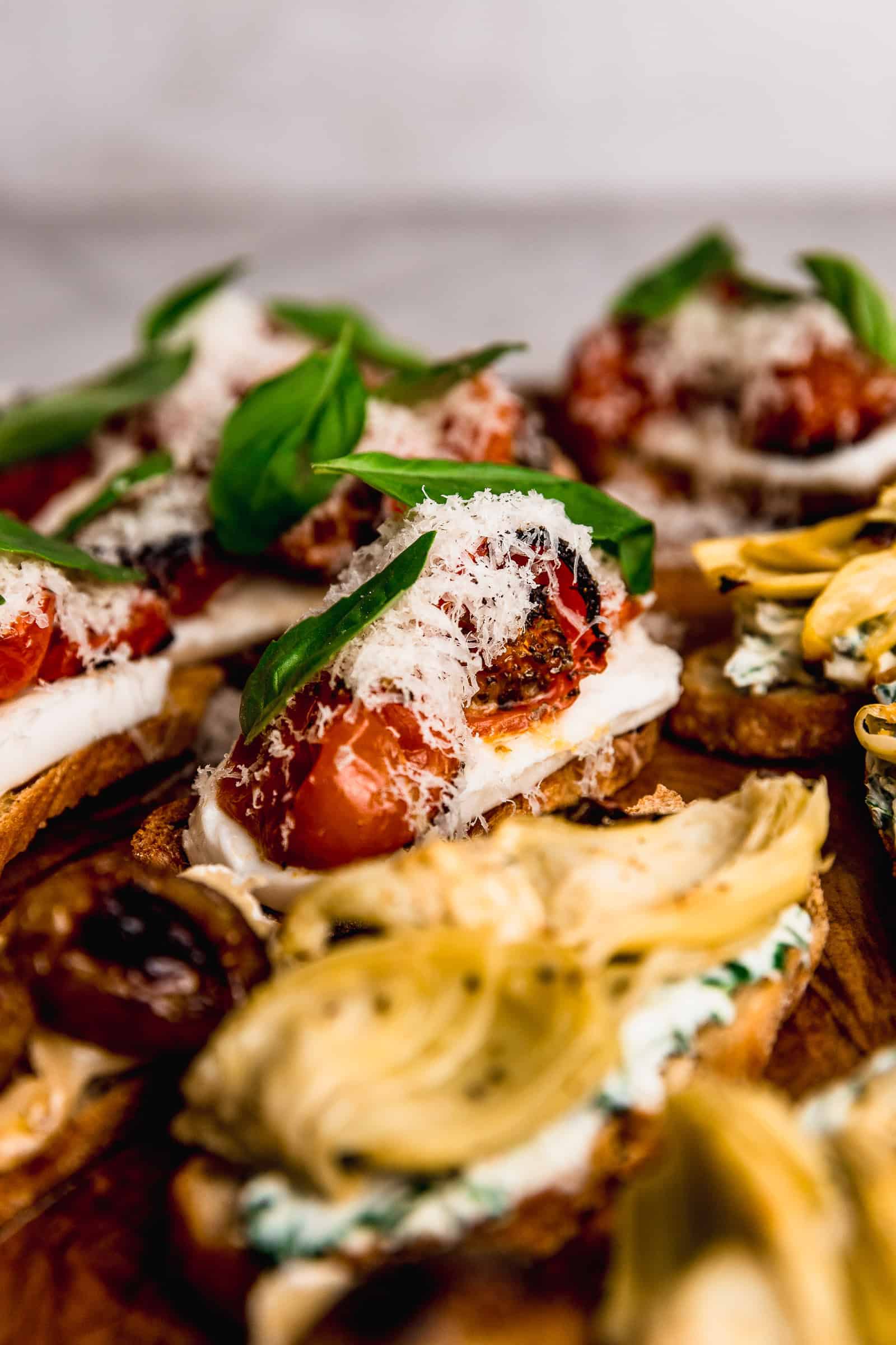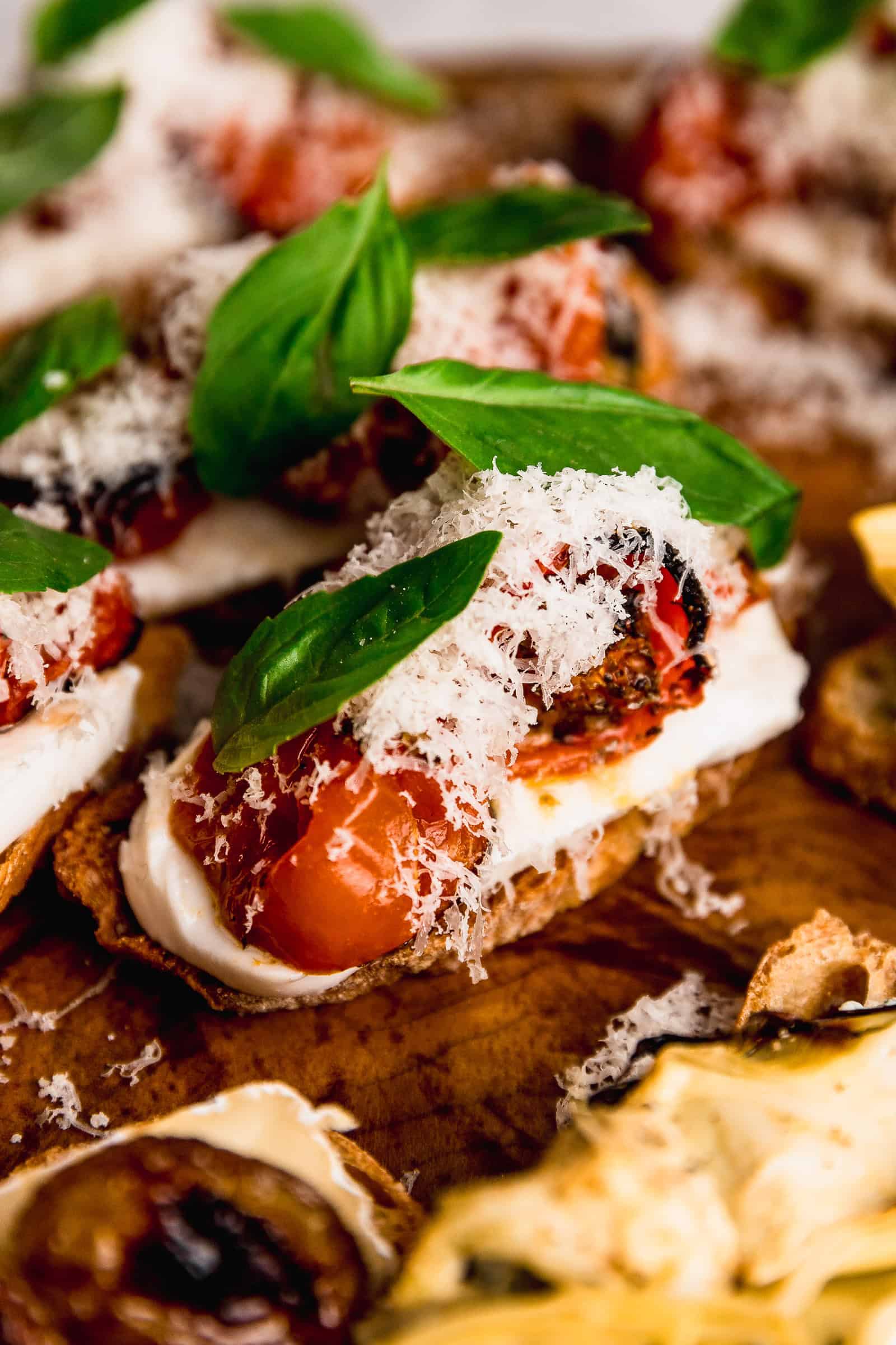 • Crostini 1: Mozzarella fresca, tomates cherry al horno, queso parmesano y albahaca.
