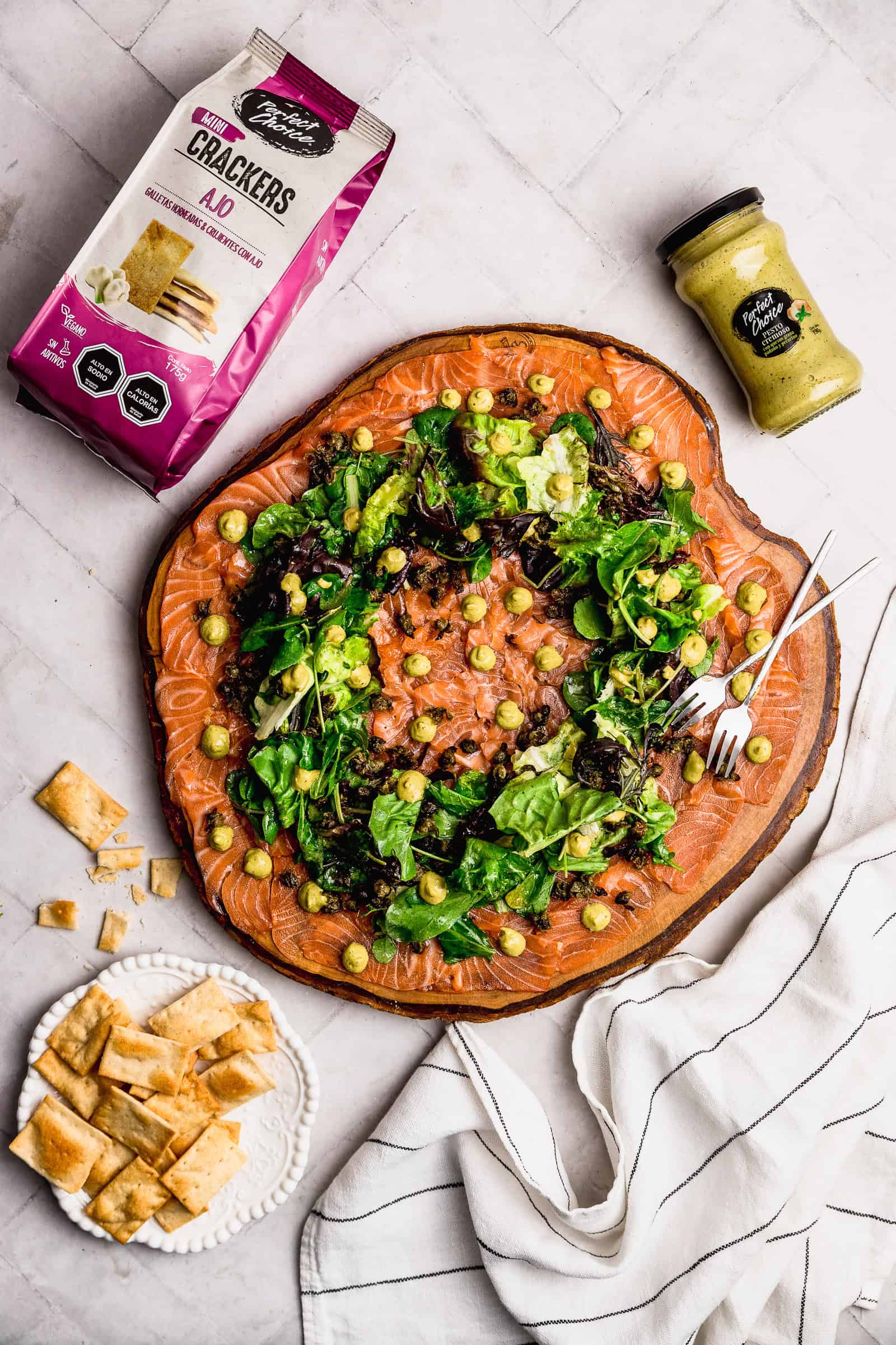 Este carpaccio de salmón tiene un toque distinto. Primero, se ve muy festivo porque tiene las hojas puestas en forma de corona de adviento. Esas hojas se aderezan rápidamente en un aderezo fácil y delicioso. Eso le da un toque fresco muy rico a la receta. Además, usamos punto del nuevo pesto cremoso de Perfect Choice que tiene ingredientes naturales y hasta queso Grana Padano y Pecorino. Para servirlos también usé las crackers de Perfect Choice que son súper ricas y delgadas.
