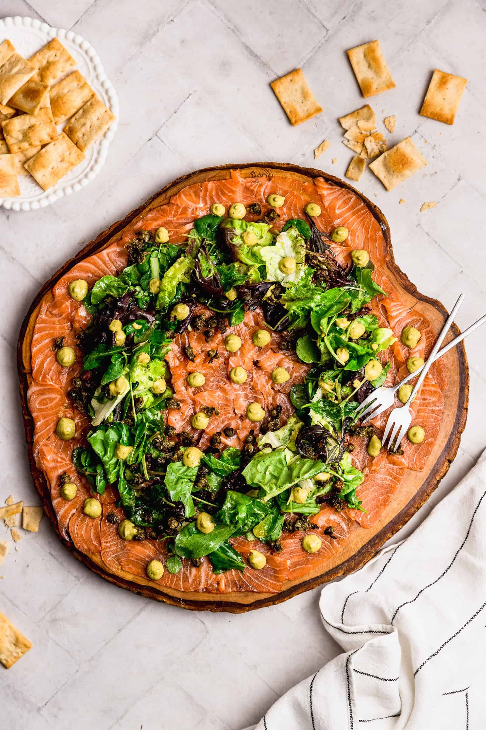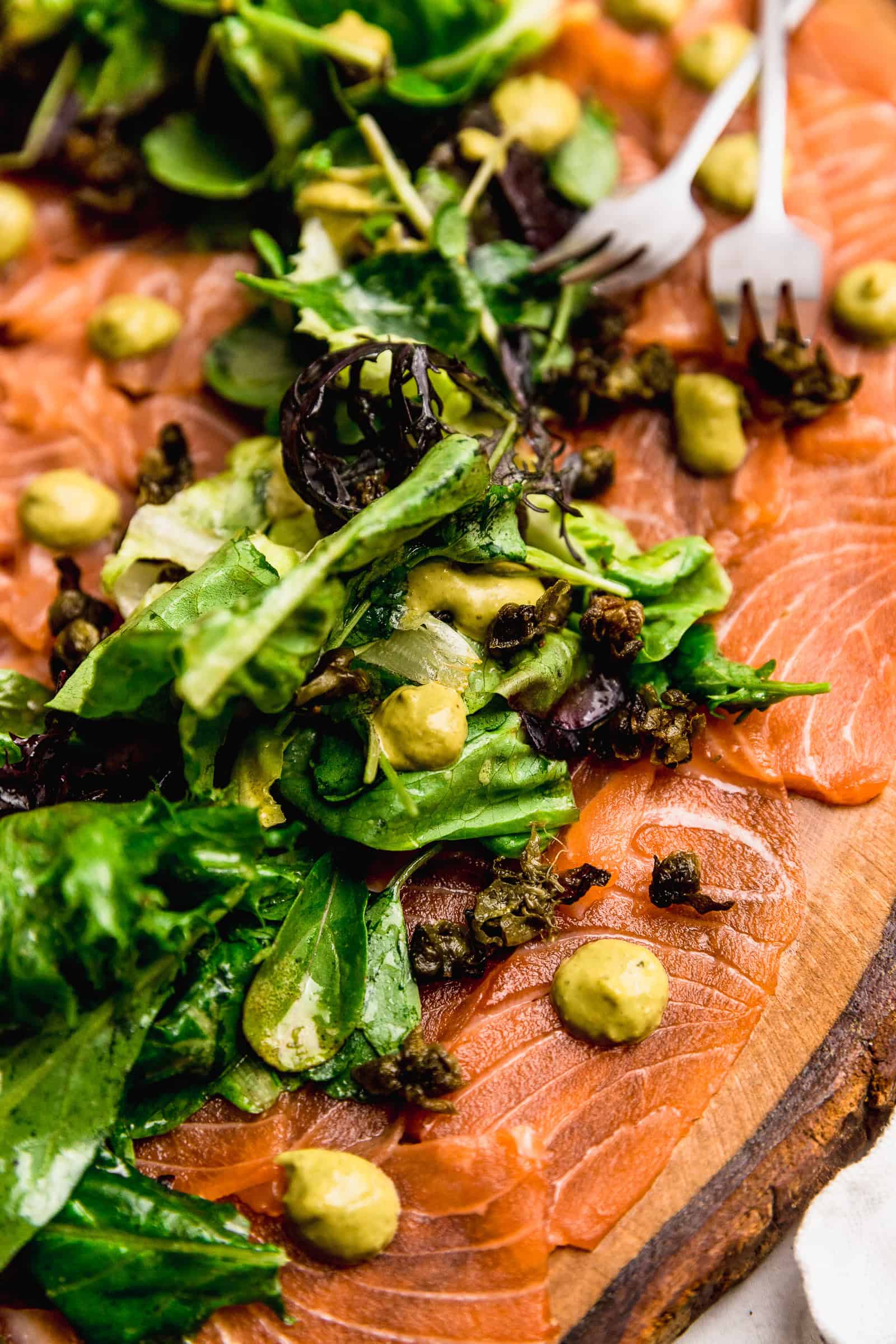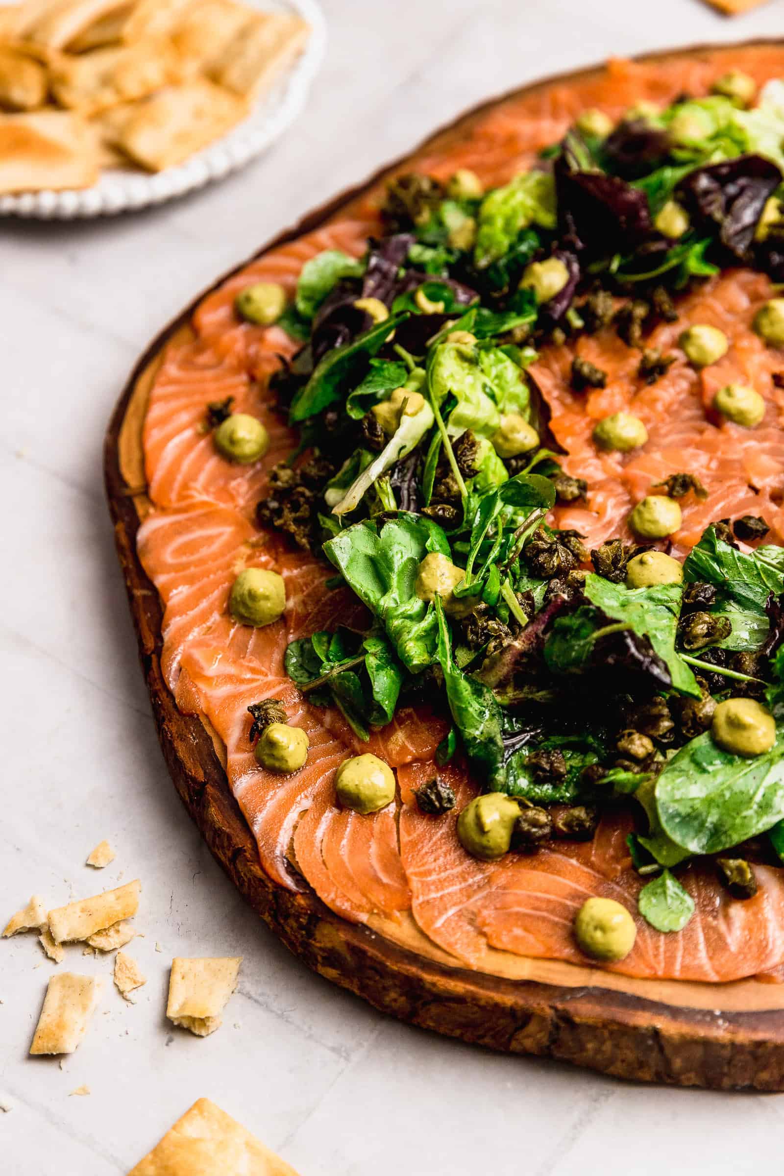 Este carpaccio de salmón con pesto y alcaparras fritas es perfecto para tener al centro de la mesa. Es precioso, con una corona de hojas aderezadas. Ideal para servir con galletitas y empezar la noche buena con mucho sabor.