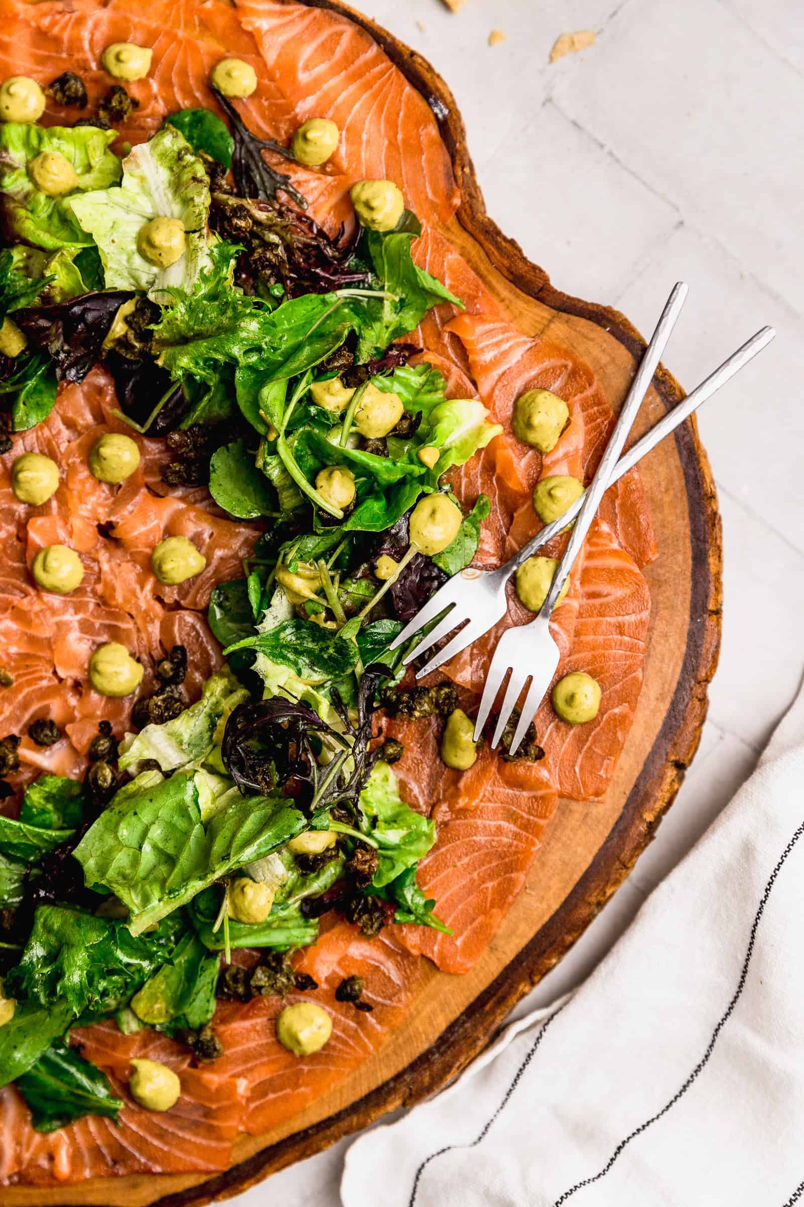 Carpaccio de salmón con pesto y alcaparras fritas