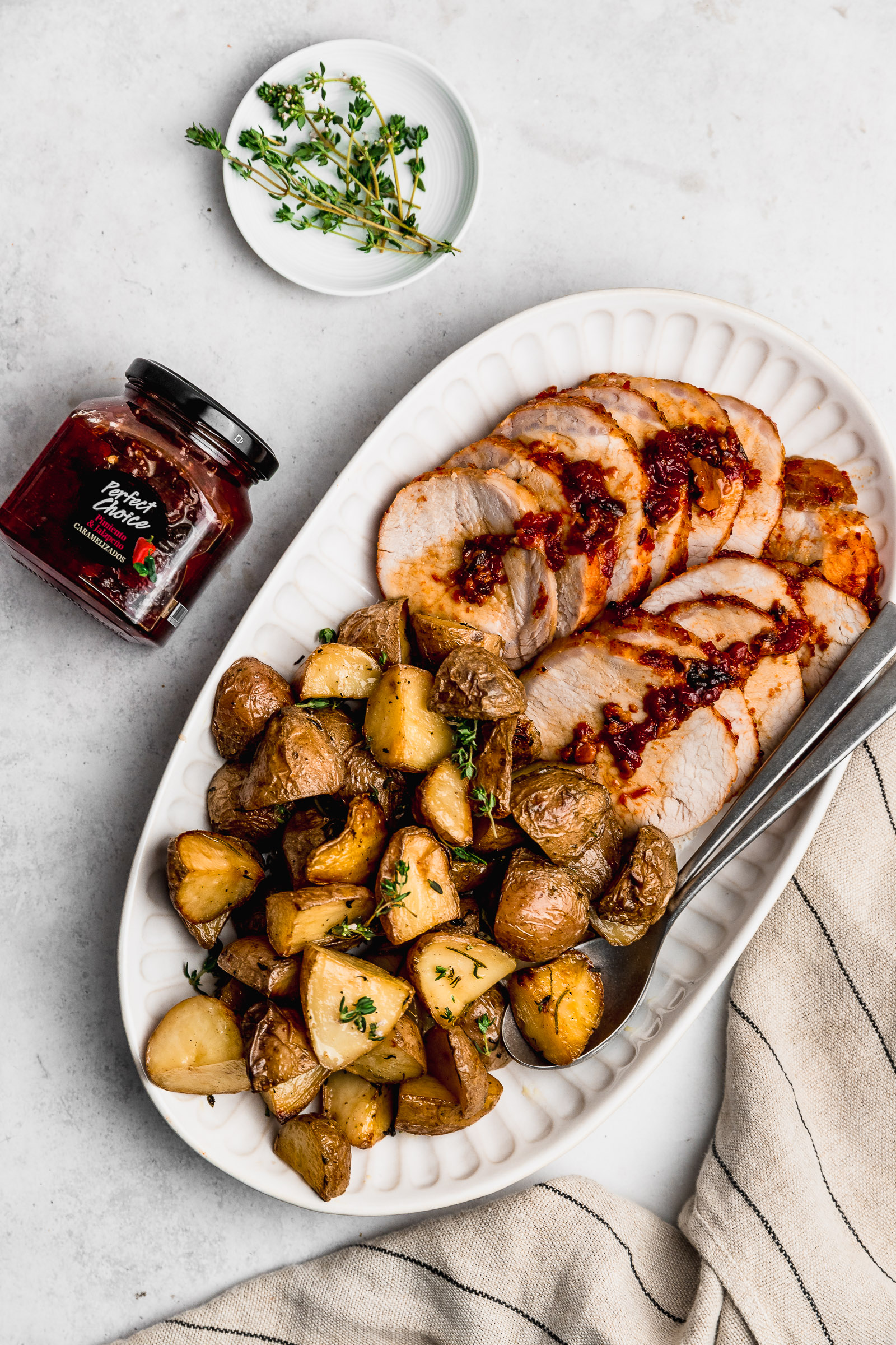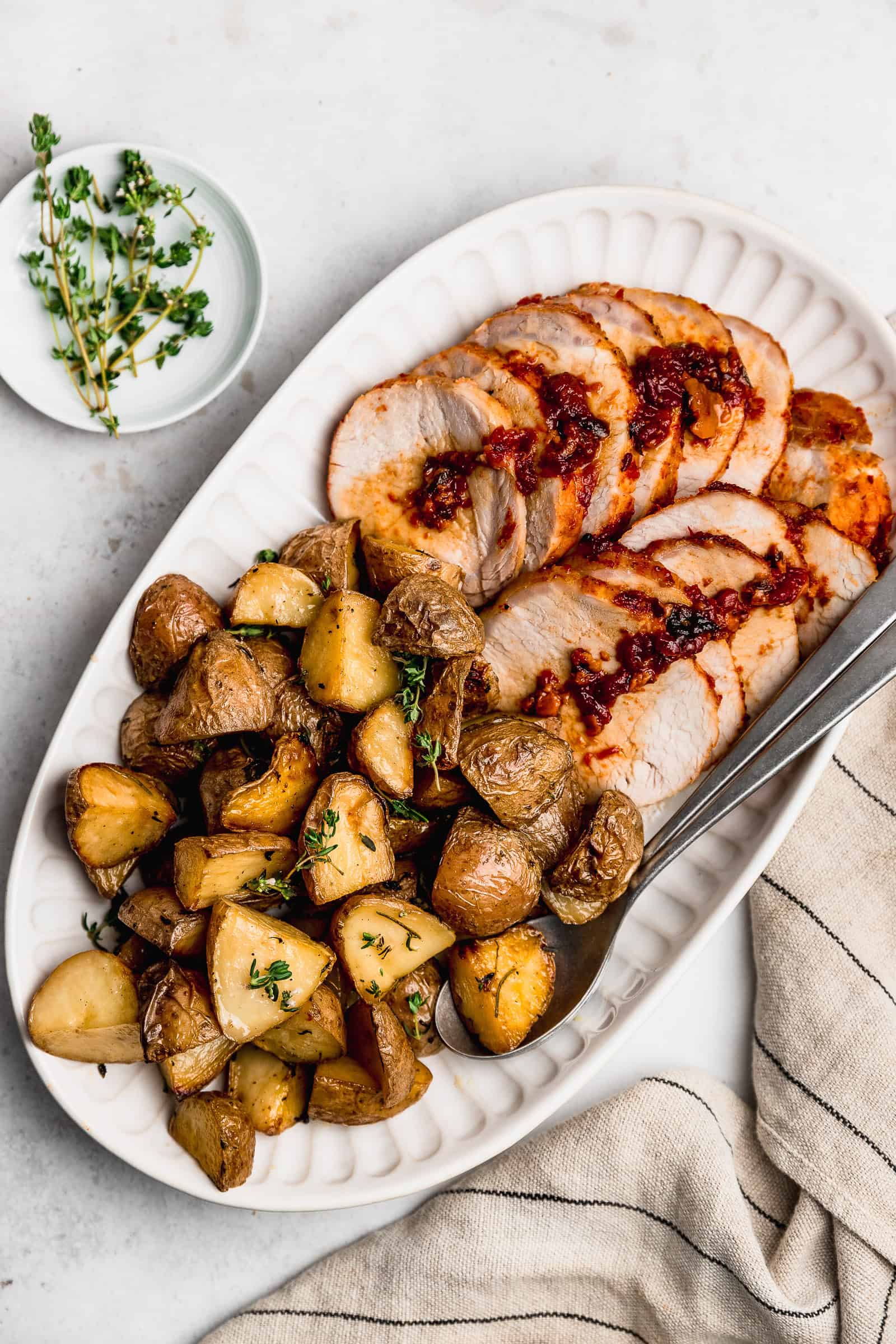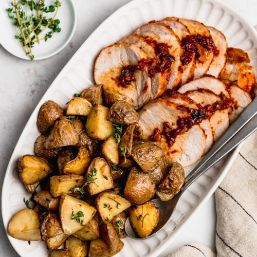 Este lomo de cerdo con salsa de pimiento es jugoso, sabroso y muy fácil de preparar. Lo sirvo con papas al horno doradas y suaves por dentro. Es agridulce y rinde bastante, lo que lo hace perfecto para celebraciones como navidad o año nuevo.