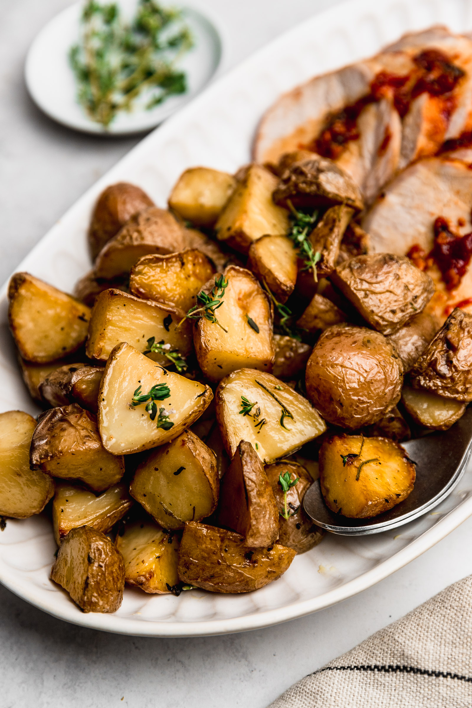 Mezcla las papas con el resto de ingredientes y hornéalas a 180℃/360℉ por 45min-1h o hasta que estén doradas. Puedes hornearlas a la vez que el cerdo.