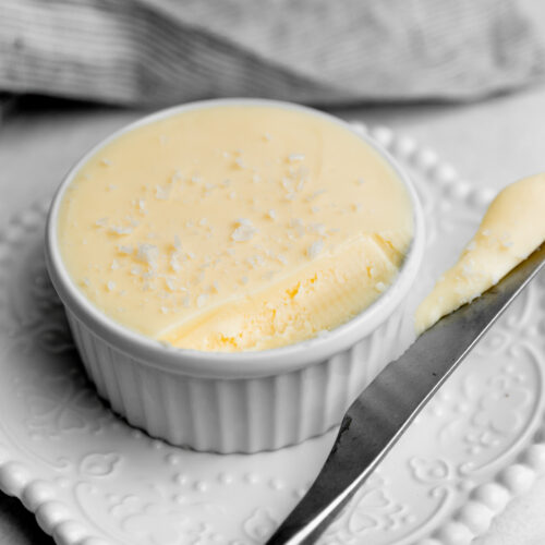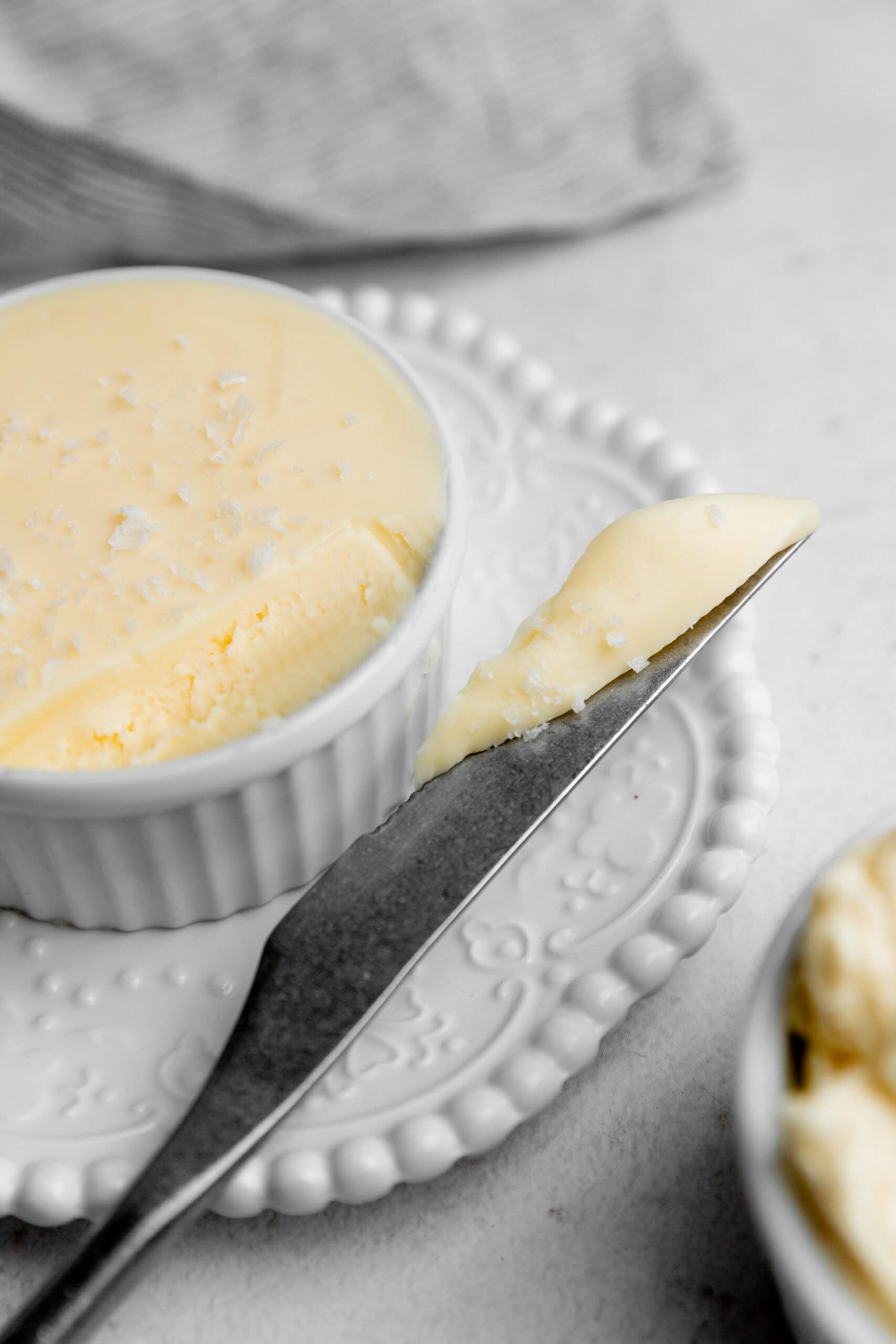 Una vez lista, la mantequilla casera te va a durar 1 mes refrigerada o hasta 6 meses congelada. Para regalar es lindo envolver en papel para hornear o ponerlo en un pocillo lindo. Además, puedes hacerle marcas o surcos en la parte superior a la mantequilla casera para que se vea súper linda. Tiene todos los mismos usos que la mantequilla comprada con la diferencia que esta es más rica jeje.