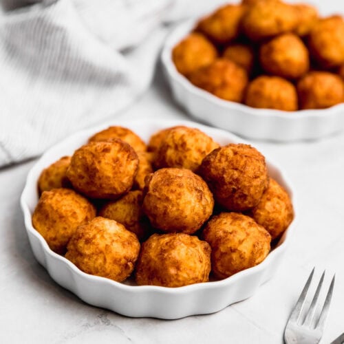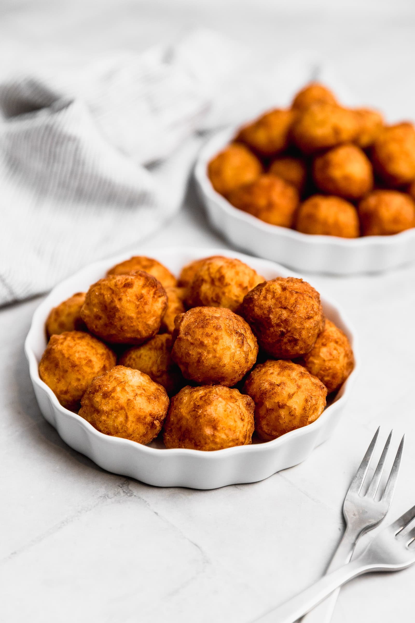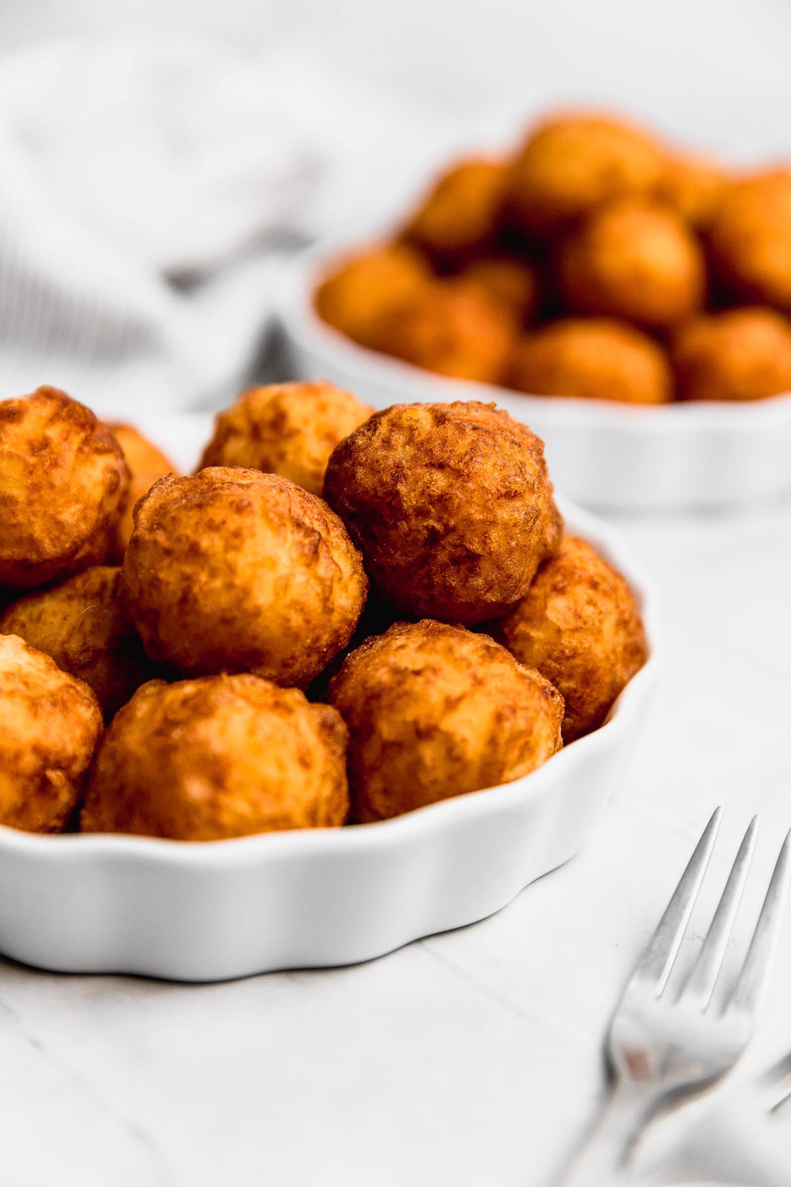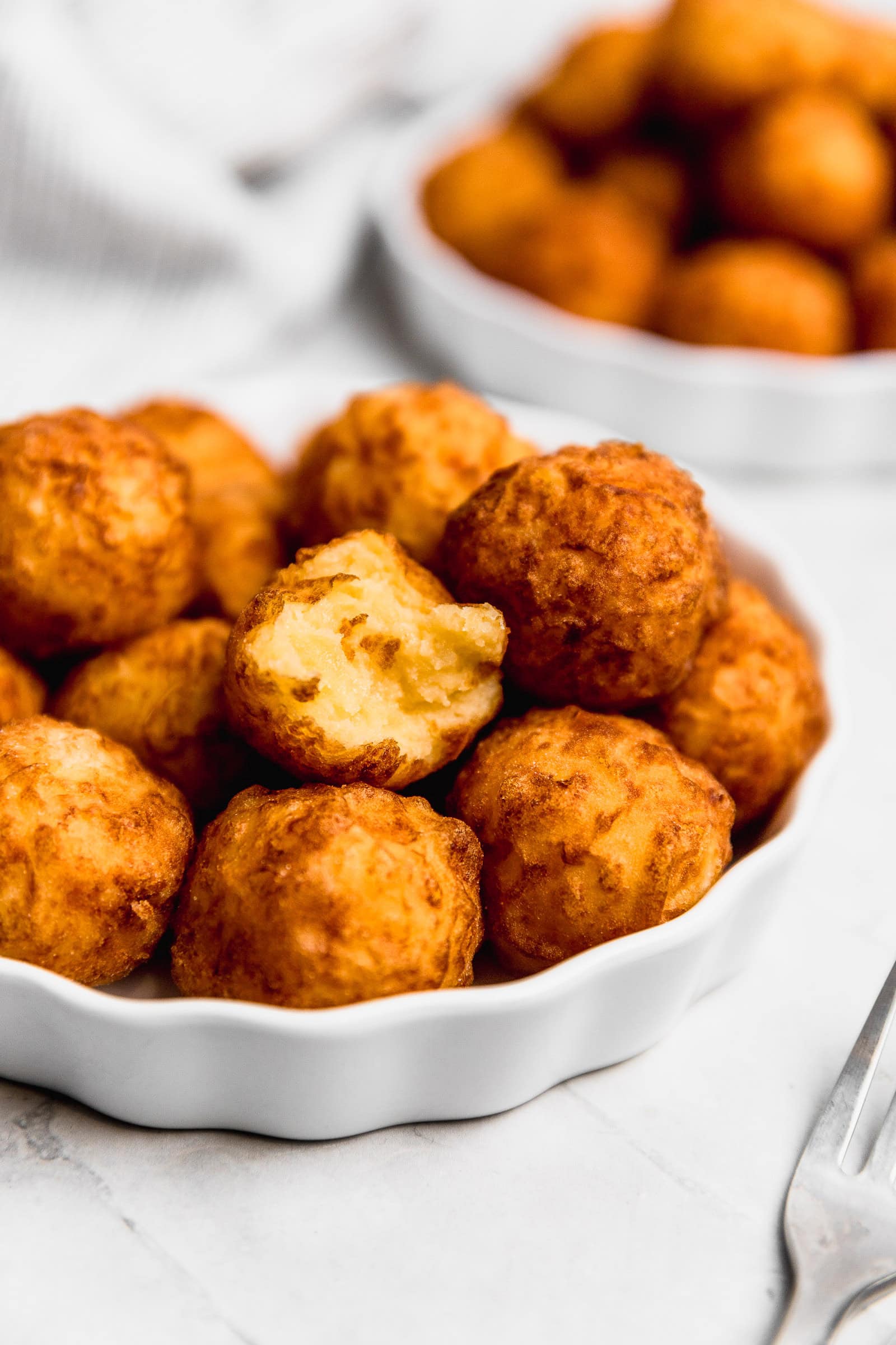 - Forma bolitas con la masa, pásalas por harina y ponlas a freír en el aceite precalentado a fuego medio (180℃/350℉) por 2-3 minutos o hasta que estén doradas. Solo fríe unas 4-5 a la vez.