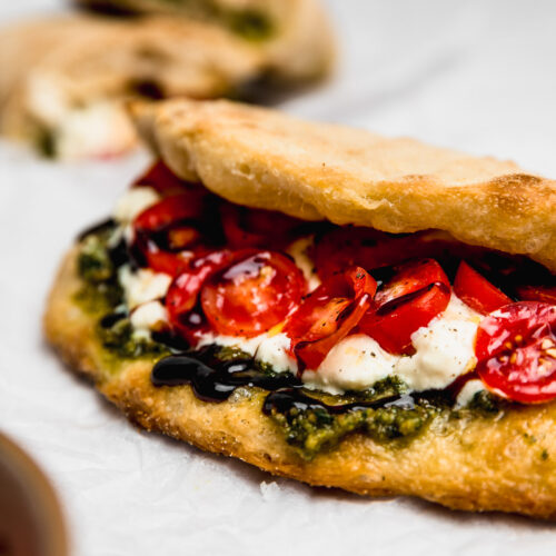 - Abre el pan para rellenar con lo que más quieras. Yo usé pesto, tomate cherry y reducción de aceto balsámico.