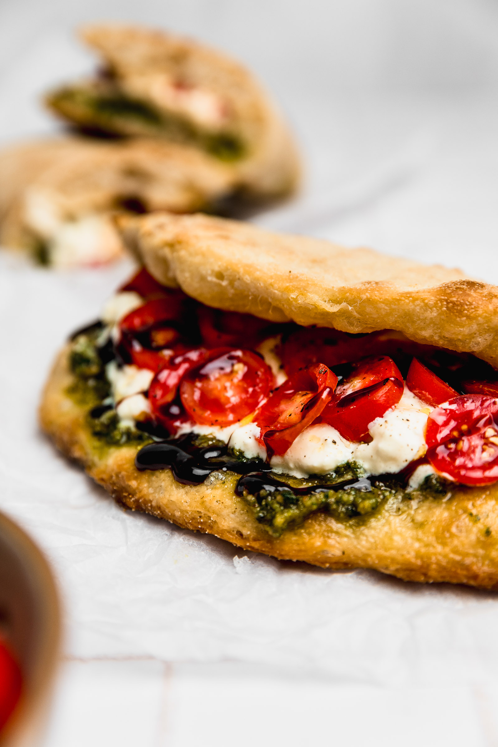 Abre el pan para rellenar con lo que más quieras. Yo usé pesto, tomate cherry y reducción de aceto balsámico.